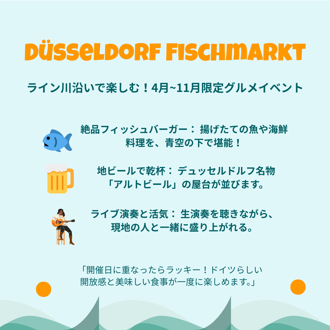 「魚市場」という名前ですが、実際には「青空の下で楽しむ巨大な食の祭典」です。ライン川の心地よい風を感じながら、新鮮なシーフード料理(特に特大のフィッシュバーガーが人気!)やドイツ名物のソーセージ、地ビールのアルトビールを楽しめます。 年に数回(4月〜11月の日曜日)しか開催されないため、「その時期に滞在する人だけが味わえる特別なイベント」です。